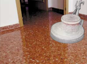 Tratamiento de acabado superficial en obra de piso interior de mosaico granítico. |