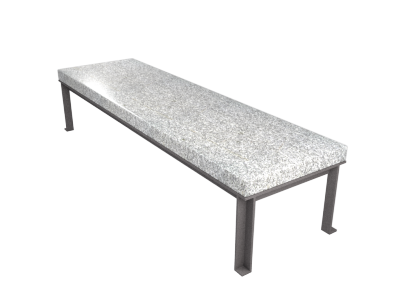 Banco de 55x42x190 cm, con asiento de pórfido patagónico y cuerpo estructural de perfiles de acero con protección antioxidante y pintura de color negro, colocación con tarugo químico, arandela y tornillo.