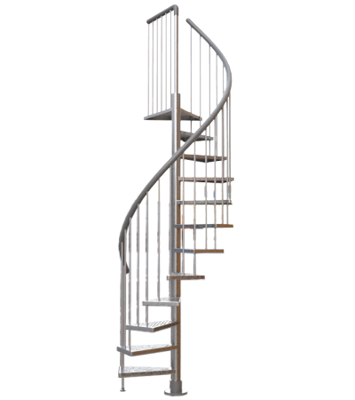 Escalera metálica de caracol para una planta interior de vivienda, de hasta 3,00 m de altura libre, de 0,60 m de ancho, formada con perfiles de acero laminado en frío, formando un árbol central de 100 mm de diámetro, peldaños de chapa estampada de 3 mm de espesor, baranda formada por barrotes verticales de redondo de acero liso y pasamanos acabado en PVC. Incluso elementos de anclaje. | ||