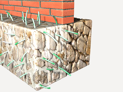 Lechada de cemento a base de agua y mortero seco de retracción compensada, inyectada a presión a través de los huecos existentes en fundación de mampostería en seco, gravas o cascotes, incrementando su capacidad portante, en recalce de fundación.
